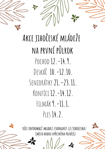 Sborové ohlášky v Husovicích - 26. října 2025 V týdnu začnou podzimní prázdniny a biblická hodina s Ondřejem Mackem se v úterý nekoná s ohledem na státní svátek. Na státní svátek 28. října se však koná v Praze slavnostní ekumenická bohoslužba "M...