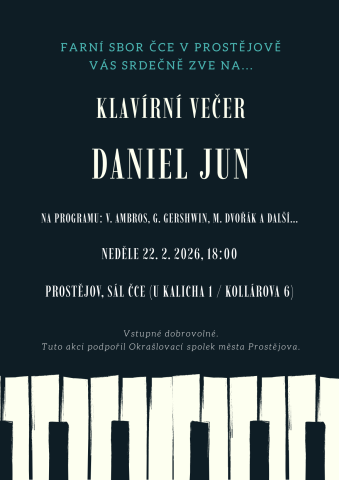 Srdečně zveme na koncert našeho milého hosta Daniela Juna. Rozezvučí sál a piano melodiemi světových i prostějovských skladatelů a doprovodí svým laskavým a vtipným slovem. V neděli 22.2.2026 od 18 h, na Kollárově 6.